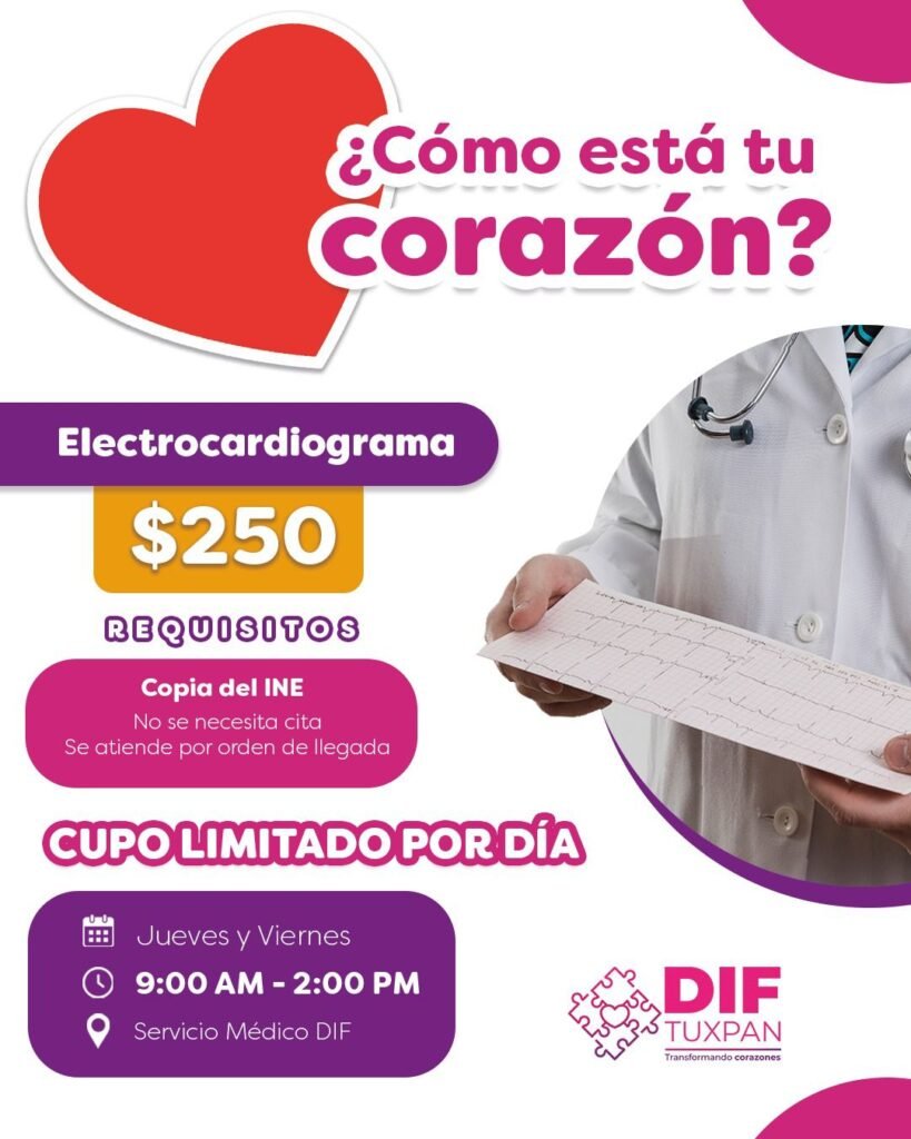 El Sistema Municipal DIF Tuxpan, pone al servicio de la población la prueba de electrocardiograma a bajo costo. Cultura Regional 21 agosto, 2025 By Editorial Praxis FacebookTwitterPinterestWhatsApp Los estudios se estarán realizando los jueves y viernes. No es necesario agendar. Conforme llegan se atienden. Cupo limitado por día. FacebookTwitterPinterestWhatsApp Editorial PraxisRevista de Cultura y Medio Ambiente. Artículos Recientes Cantos de Piedra: La obra de Roxana Cervantes en el Museo de Antropología de Xalapa Arte 24 octubre, 2025 Envía gobernadora al Congreso iniciativa para fortalecer la Secretaría de Cultura Cultura 23 octubre, 2025 El riesgo ambiental por derrame de hidrocarburos en el río Tuxpan Cultura 22 octubre, 2025 Vive el 26º Festival Cultural Mictlán en Xalapa: una tradición escénica en Veracruz Cultura 22 octubre, 2025 MÁS DEL AUTOR Sesiones de Cabildo se transmitirían en vivo, propone diputado LXVII Legislatura 23 octubre, 2025 Presenta diputado iniciativa que busca avanzar en la escrituración de escuelas LXVII Legislatura 23 octubre, 2025 Por contingencia, otorgaría Orfis prórroga para cumplir con entrega de información LXVII Legislatura 23 octubre, 2025