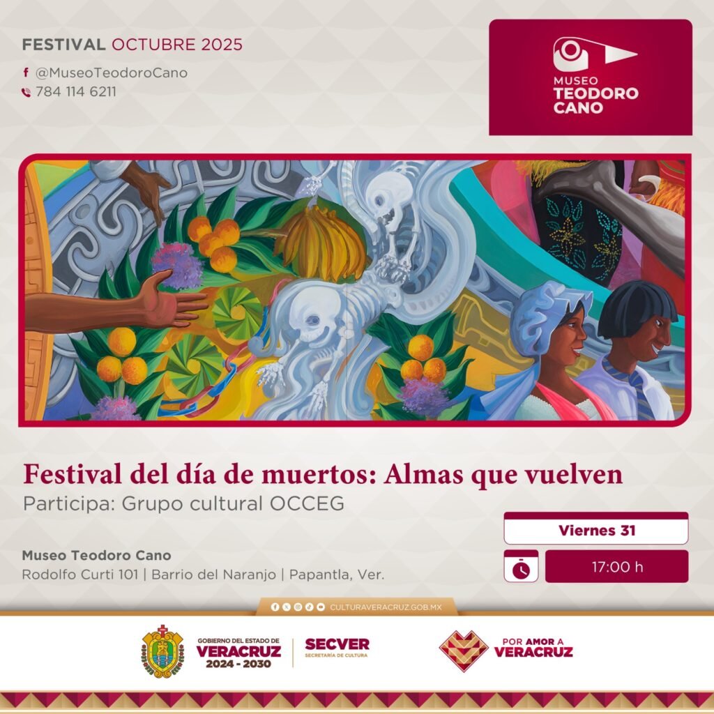 Xalapa, Ver., miércoles 29 de octubre de 2025.- La Secretaría de Cultura de Veracruz (SECVER) invita al público a disfrutar de las actividades de Día de Muertos, que se realizarán el próximo viernes 31 y sábado 01 de noviembre en el auditorio del Museo Teodoro Cano en Papantla. La entrada es gratuita.