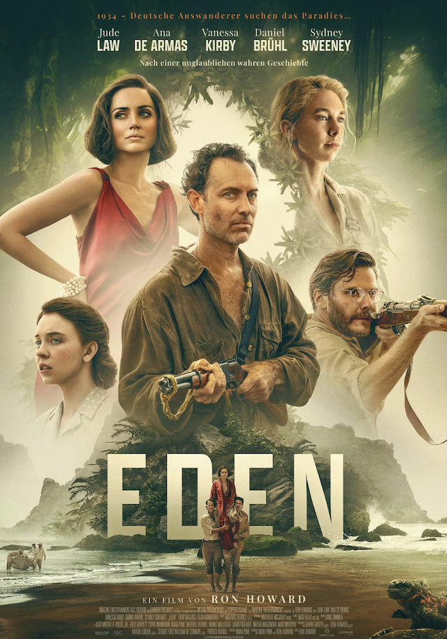 Ron Howard (director de las exitosas “Apolo 13”, “Una mente brillante”, “El código Da Vinci”, y la pésima “Hillbilly Elegy”), se hizo cargo de un proyecto titulado, tentativamente, “El origen de las especies”, por aquello de estar situada la historia en las Galápagos, las “encantadas islas de Darwin”, como se las ha denominado, pero que hubiera resultado incomprensible más allá de dicha anécdota histórica y que, por fortuna, cambiaron por “Eden”, un título más irónico y mordaz. Noah Pink (guionista de la serie “Genius”), escribió la historia, en equipo con Howard, tomando los libros de las supervivientes como base argumental, en paralelo a la portentosa fotografía que corre a cargo de Mathias Herndl, que logra captar el estado prístino y, por esto, salvaje, de la isla desde tomas generales y aéreas, que sitúan a los colonos no sólo en su pequeña perspectiva, sino como a seres advenedizos, vigilados por una grandeza ajena, casi divina, que parece desdeñarlos. Jude Law interpreta al sudoroso y agotado Friedrich Ritter, tantas veces al borde del colapso, no sólo por el hambre que lo acucia, sino por el orgullo que le obliga a ocultar el arrepentimiento de haberse metido en tal brete, y no traicionar sus principios, que quizá nunca fueron tan sólidos; Vanessa Kirby a Dore Strauch, avejentada, y cada vez más enferma por la esclerosis, lo que la obliga a caminar apoyándose en una muleta, dando a entender que la cura de Ritter ha fracasado, y que no es suficiente con el uso de la voluntad para sanar, a quien el doctor extrae un diente cariado con pinzas, sin anestesia; Daniel Brühl a Heinz Wittmer, entregado totalmente a la tarea de levantar su nuevo hogar, y Sydney Sweeney a Margret, mujer sufrida por las durísimas tareas en la colonia que, no obstante, al final, victoriosamente, opte por quedarse, aun con la oportunidad que le ofrecen las autoridades de salir del infierno de Floreana, mientras Ana de Armas personifica a la aprovechada baronesa Eloise Bosquet de Wagner Wehrhorn, amanerada y mentirosa. El peso de la historia recae, pues, sobre la sensata y abnegada Margret, que Sweeney interpreta estoicamente.