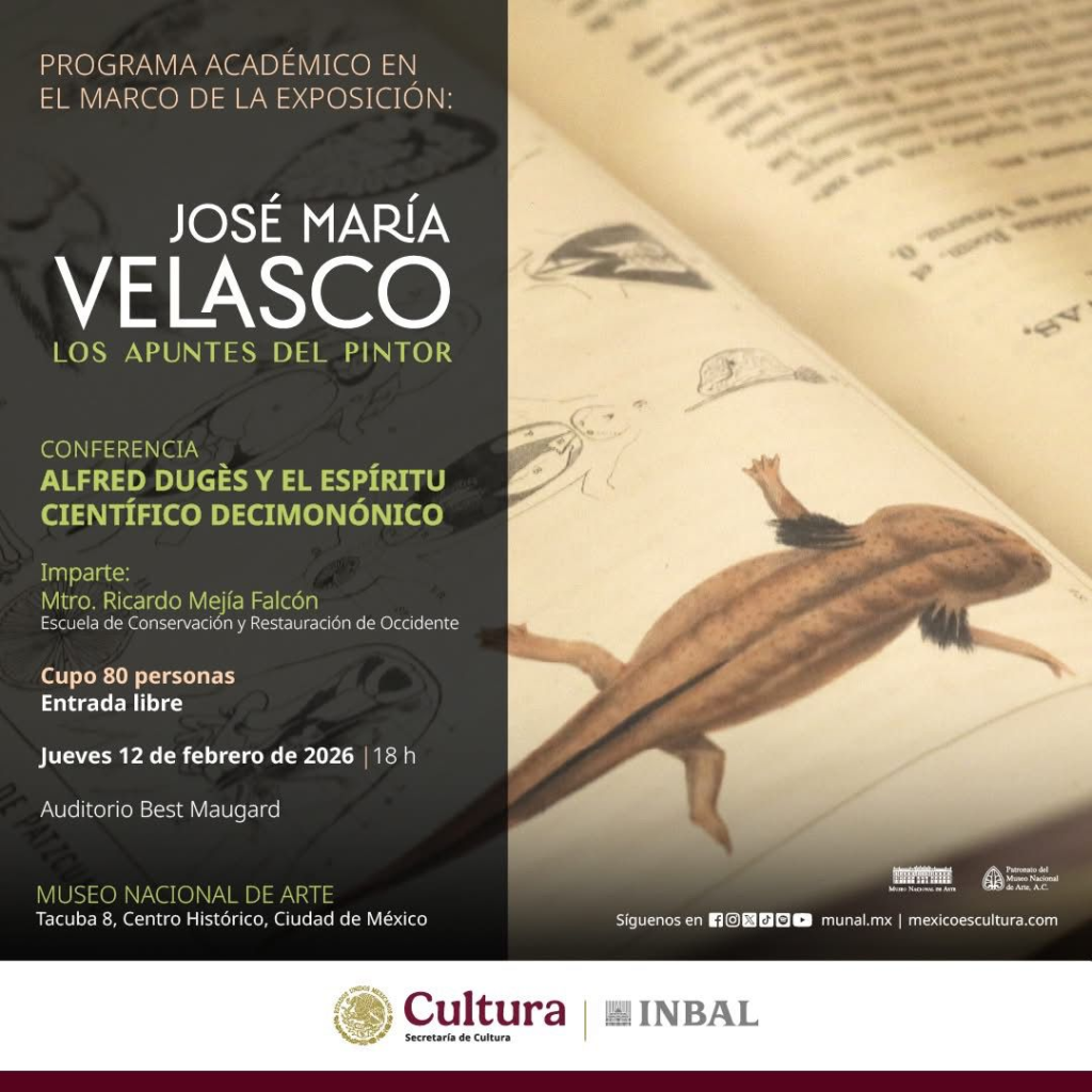 Organizadas en el marco de la exposición José María Velasco. Los apuntes del pintor, las charlas iniciarán el 12 de febrero, a las 18 horas, con “Alfred Dugès y el espíritu científico decimonónico”, a cargo de Ricardo Mejía Falcón, de la Escuela de Conservación y Restauración de Occidente, quien hablará sobre la producción intelectual y visual de Velasco, así como de las redes que mantuvo con científicos y artistas, entre ellos el zoólogo Alfredo Dugès, cuyo archivo fue reconocido como Memoria del Mundo por la UNESCO.